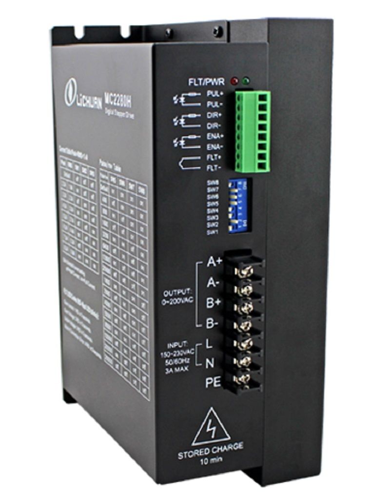 ProductName: two-phase digital stepper driver MC2280H MC2280H adopts advancedservo control principle technology, has the motor parameter self-adaptingfunction, guarantees the best performance of the motor, and is suitable for the86-130mm two phase hybrid stepping motor. This technology can greatly reducethe noise and vibration of the motor when it is running, and make the noise andstability of the stepping motor approach the level of the servo motor. Comparedwith most of the market segments of the same type of drive products, steppermotors and drives of thermal decline of 15-30% function description Function | Operation instructions | Operating current setting | The output current of thedriver is set by the three dial switches of SW1-SW3, and the output currenthas 8 levels. For specific output current settings, refer to the drive panelinstructions. | Automatichalf current function | Setthe auto semi current function of the drive through the SW4. The OFFindicates that the quiescent current is set at half of the dynamic current,and the ON represents the same static current as the dynamic current. Forgeneral use, the SW4 shall be set to OFF to reduce heating and improvereliability of the motor and actuator. After the pulse string stops, about 0.4secondsor so, the current automatically reduces by 50% (actual value 65%), thecalorific value theoretically reduces 35%. | Microstep subdividesetting | By the SW5-SW8 four dialswitch set microstep subdivide, the total of 15 stalls microstep. When theuser sets the subdivision, the drive should be stopped. The micro set, pleasecheck the drive panel. | Indicator light | The drive has red andgreen lights. The green light is the power indicator lamp. When the drive ispowered on, the green light is always on; the red light is the faultindicating lamp, and when the overvoltage and overcurrent faults occur, thetrouble lamp is always on. After the fault is clear, the red light goes out.When the drive fails, only the power on and re enable to clear the fault. | Signal interface | PUL+ and PUL- are thepositive and negative ends of the control pulse signals; the DIR+ and DIR-are the positive and negative ends of the directional signal; ENA+ and ENA-are the positive and negative ends of the enabling signals. | Motor Interface | The A+ and A- areconnected with the positive and negative ends of the A phase winding of thestepping motor; B+ and B- are connected with the positive and negative endsof the B phase winding of the stepping motor. When the A and B two phasewindings are switched, the motor direction is reversed. | Powerinterface | Theoperating voltage range is recommended as 80-220VAC. | Installation instructions | Drive dimensions are: 187×137×81mm.It can be installed horizontally or vertically (vertical installation isrecommended). When installed, it should be attached to the metal cabinet tofacilitate heat dissipation. |